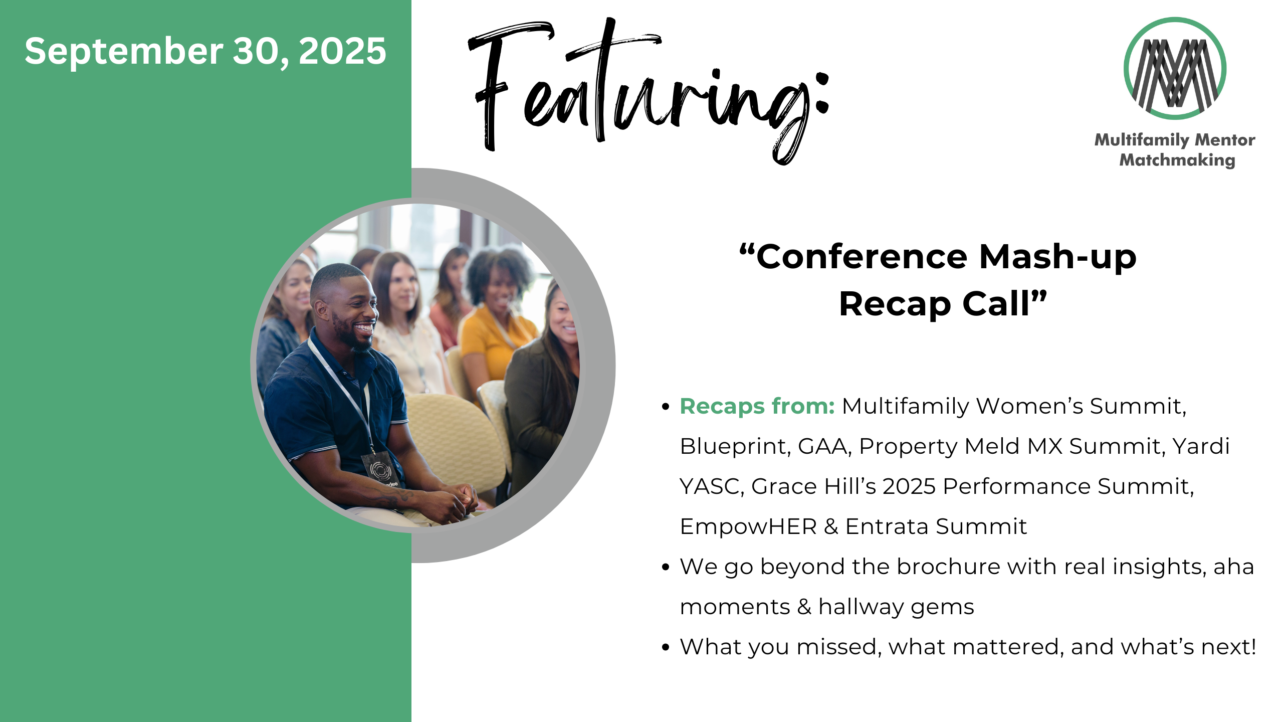 We can’t all be everywhere but we can share the takeaways that don’t make it into the brochure. In this call, members will bring back highlights, aha moments, and those behind-the-scenes gems from: Multifamily Women’s Summit, Blueprint, GAA, Property Meld MX Summit, Yardi YASC, Grace Hill’s 2025 Performance Summit, EmpowHER & Entrata Summit. Zoom Link